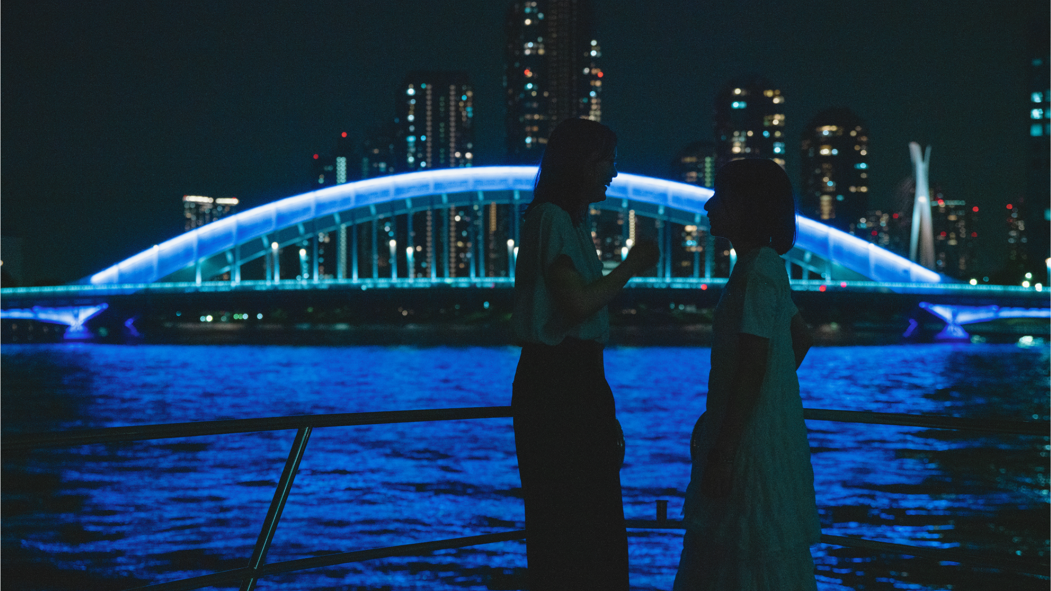 個々の橋の特徴をイメージしたカラーのライトアップが水面を照らし、幻想的な世界を創り出します