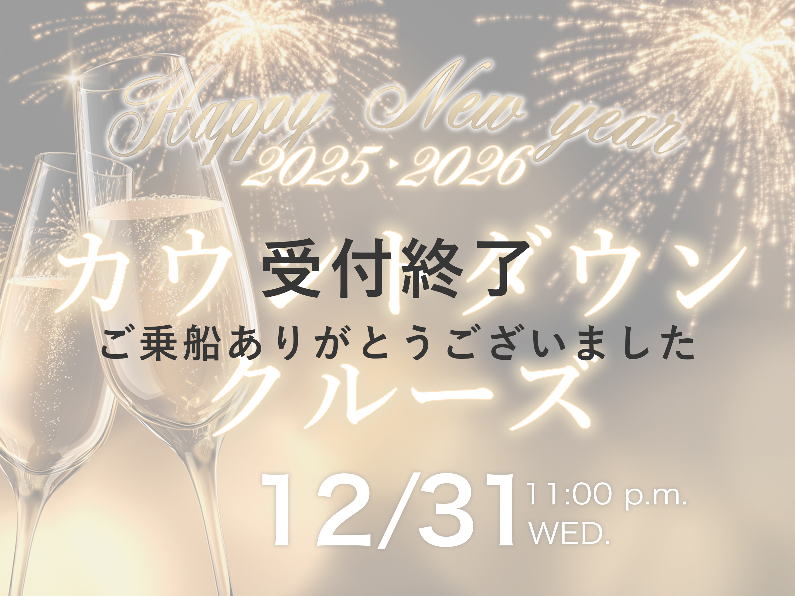 クルーズ時間 2025年12月31日(水)23時00分出航 2026年1月1日(木)午前1時00分帰航 2時間クルーズです!
