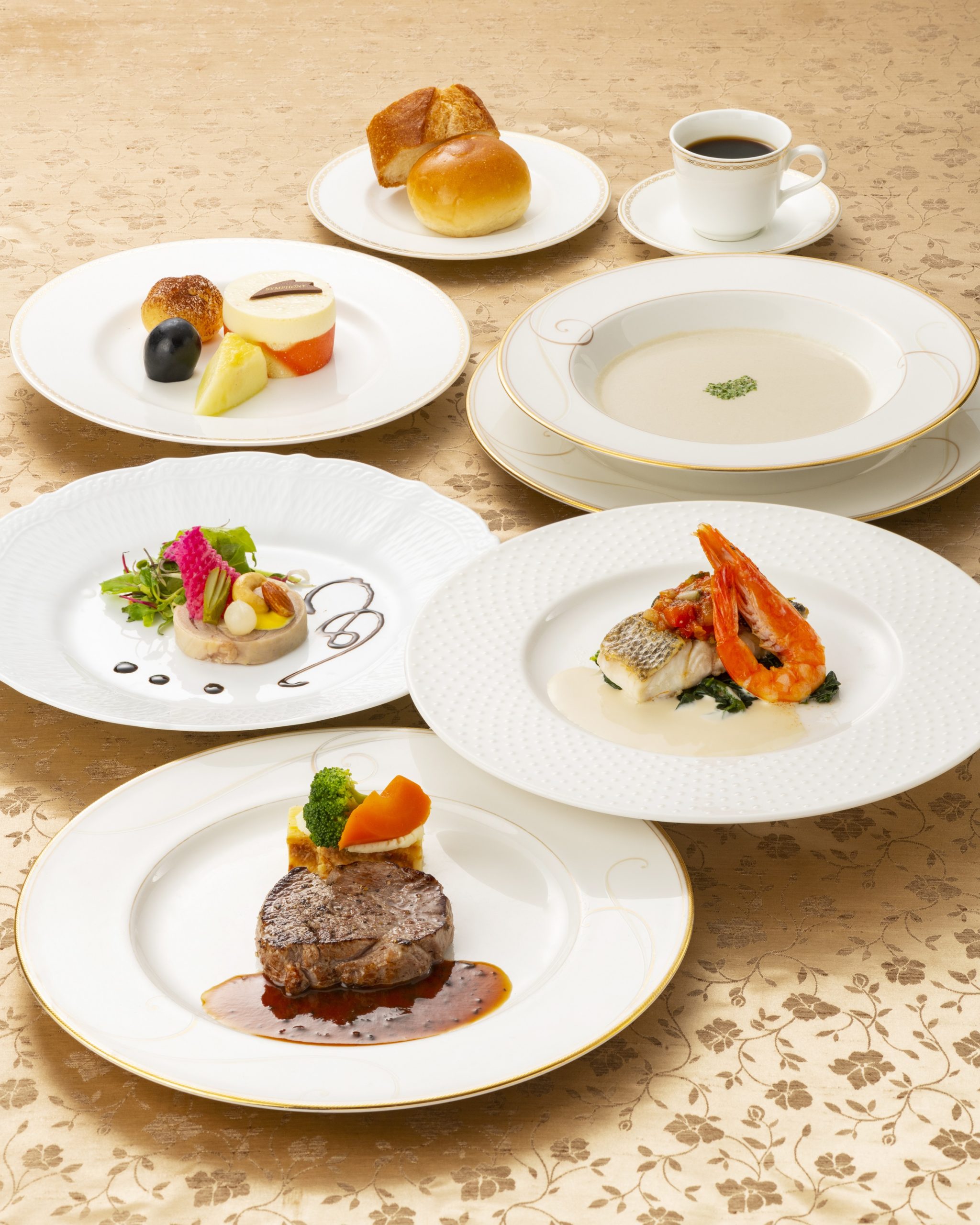 【着席】フランス料理コース :4~6品、パン、デザート、コーヒー【着席】ブッフェ料理コース :約20種類以上の冷製料理、温製料理、デザート