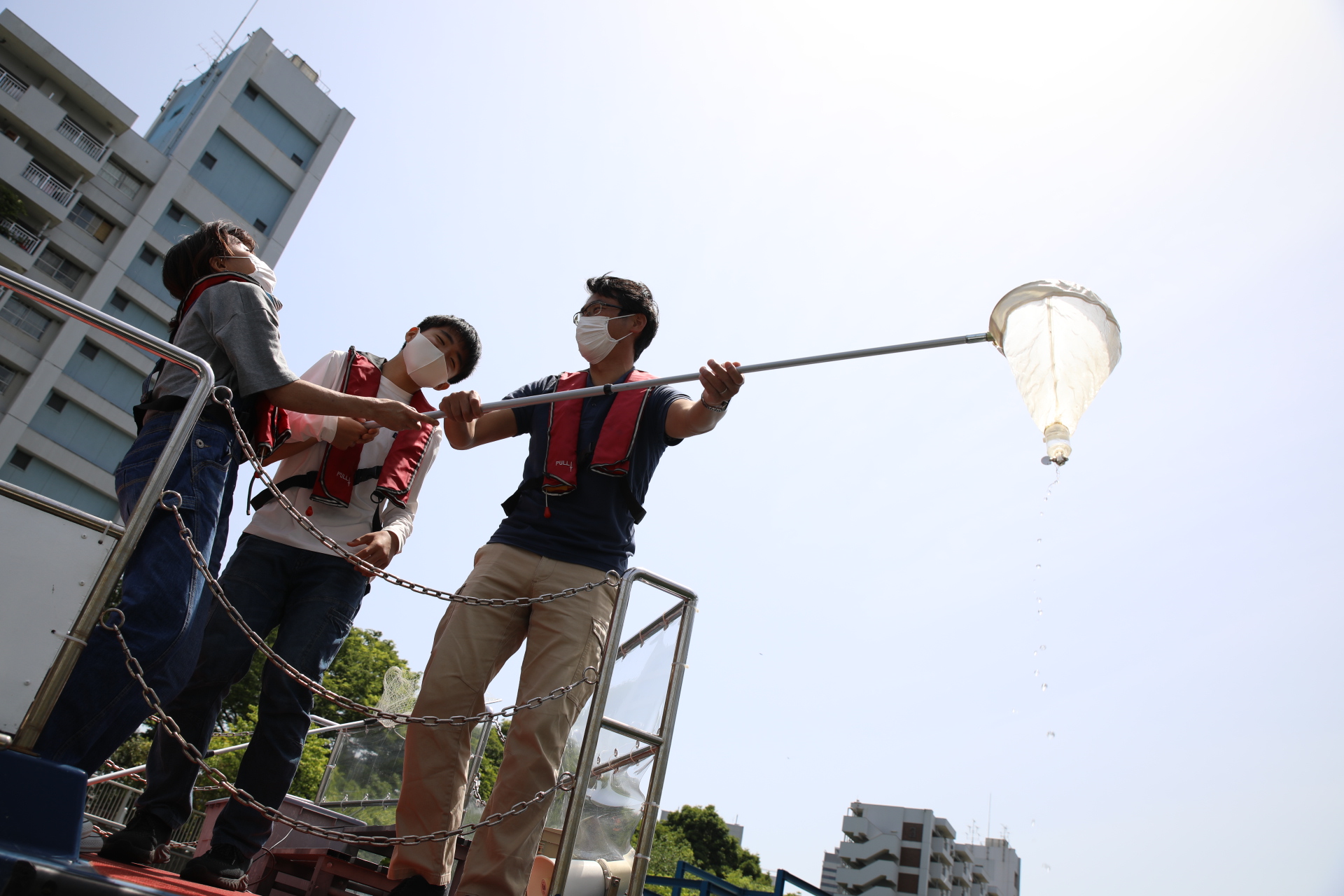 実際に船に乗船しながら東京の水辺で採水体験をし、採取した水を観察します。