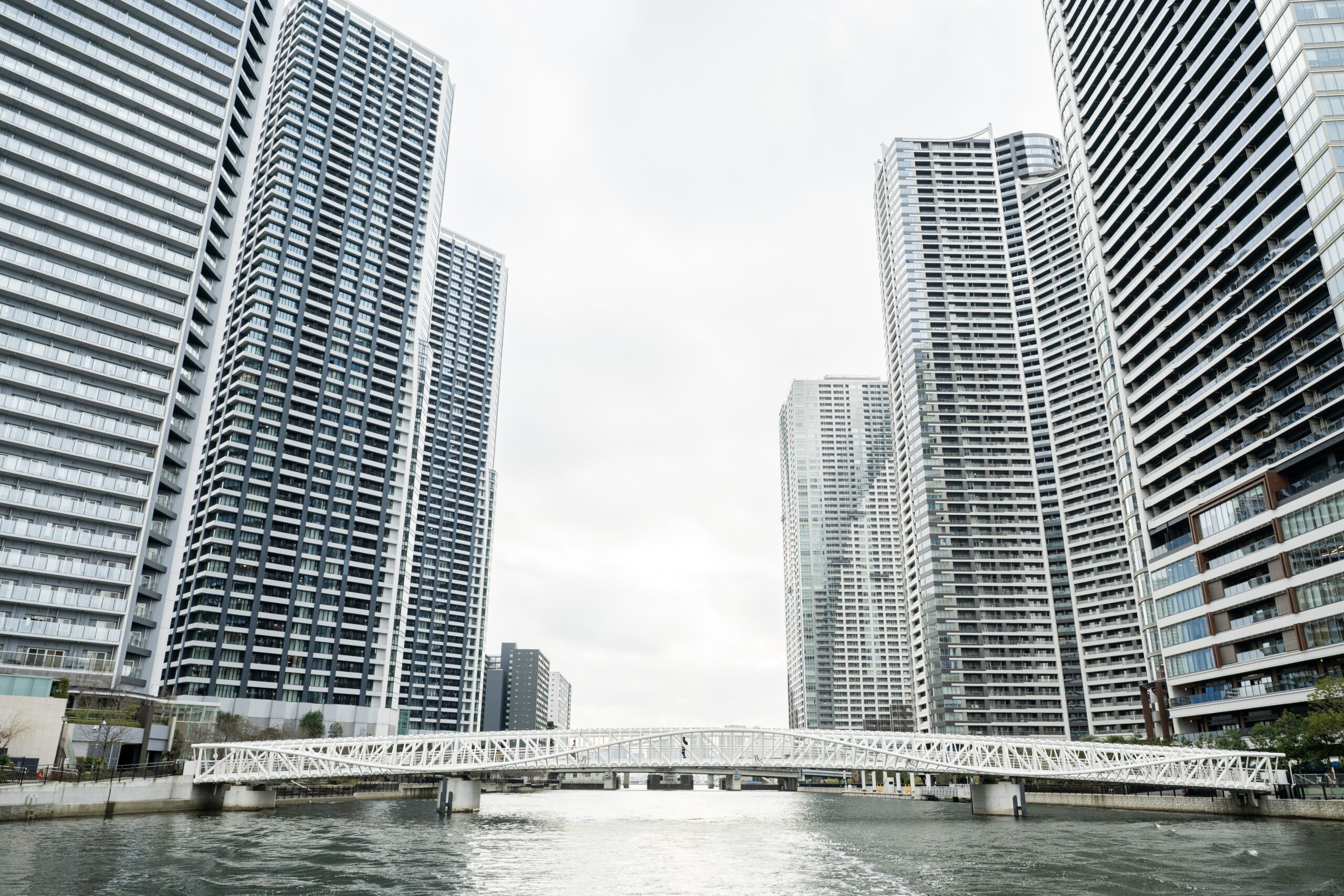 川面から見上げる橋梁、倉庫建築、再開発エリアのランドマーク。