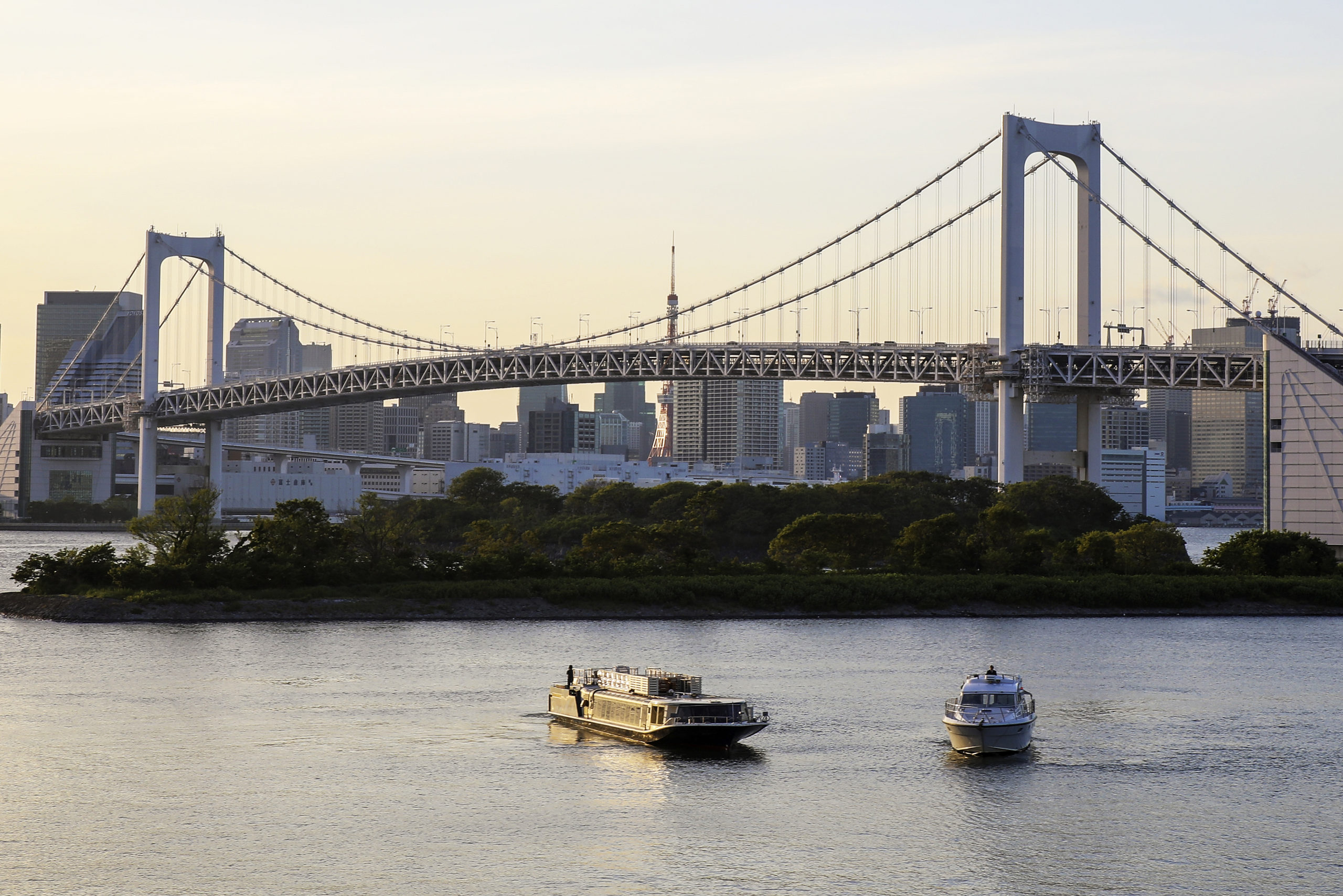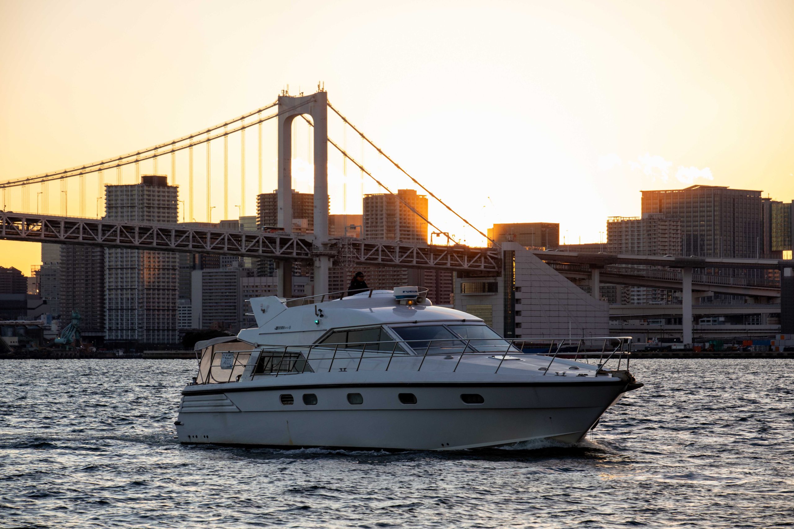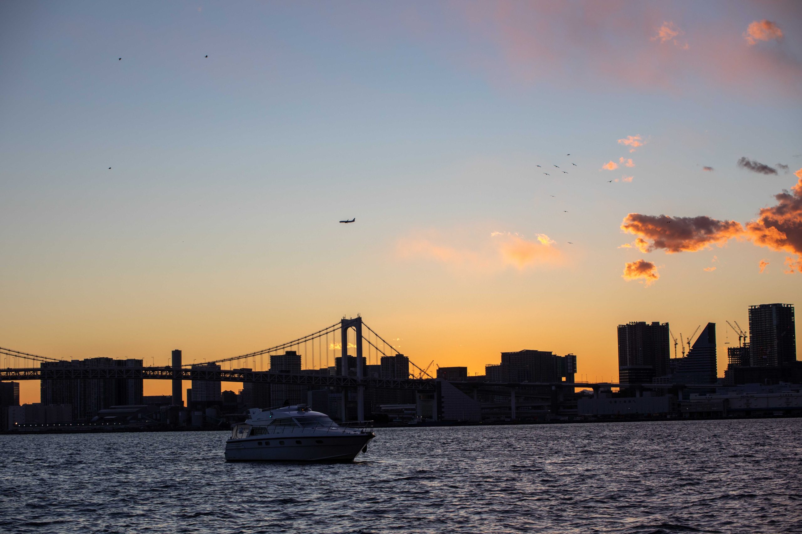 運河を抜け見えてくるのは、サンセットに照らされるレインボーブリッジ、お台場、大井品川埠頭。